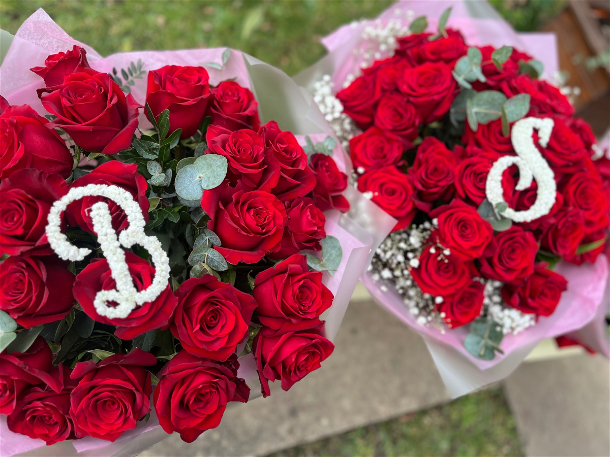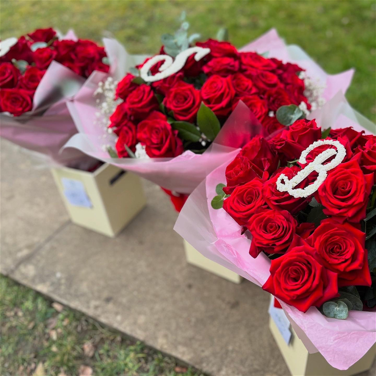 Add on this handmade all gypsophila initial and love heart to your red rose bouquet for that personal touch