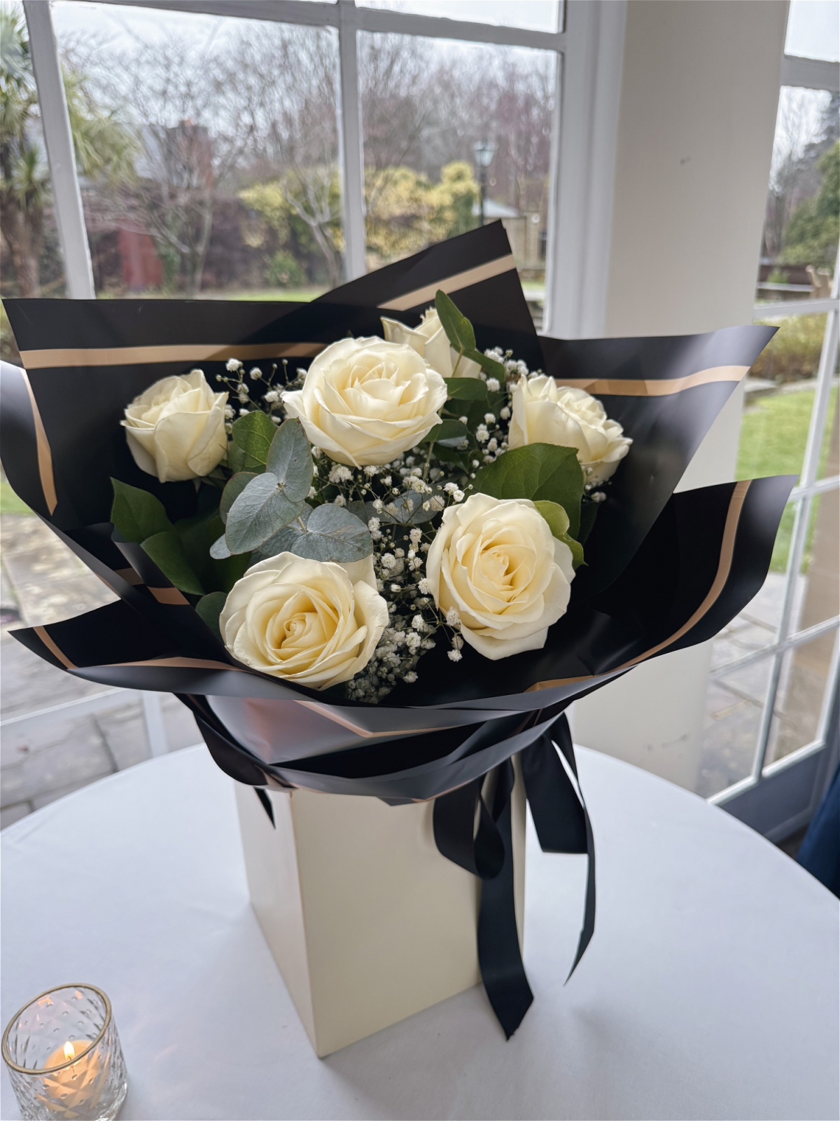 6 of the most stunning roses available this Valentine’s Day Accompanied by gorgeous greenery and beautiful gypsophila all beautifully arranged in a hand tied bouquet wrapped and finished off with a water bubble to keep the flowers fresher for longer.