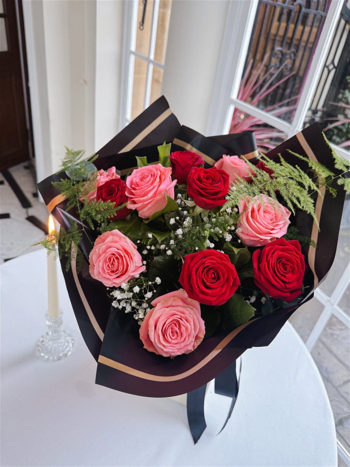 WOW!! 24 of the most stunning roses available this Valentine’s Day Accompanied by gorgeous greenery and beautiful gypsophila all beautifully arranged in a hand tied bouquet wrapped and finished off with a water bubble to keep the flowers fresher for longer.