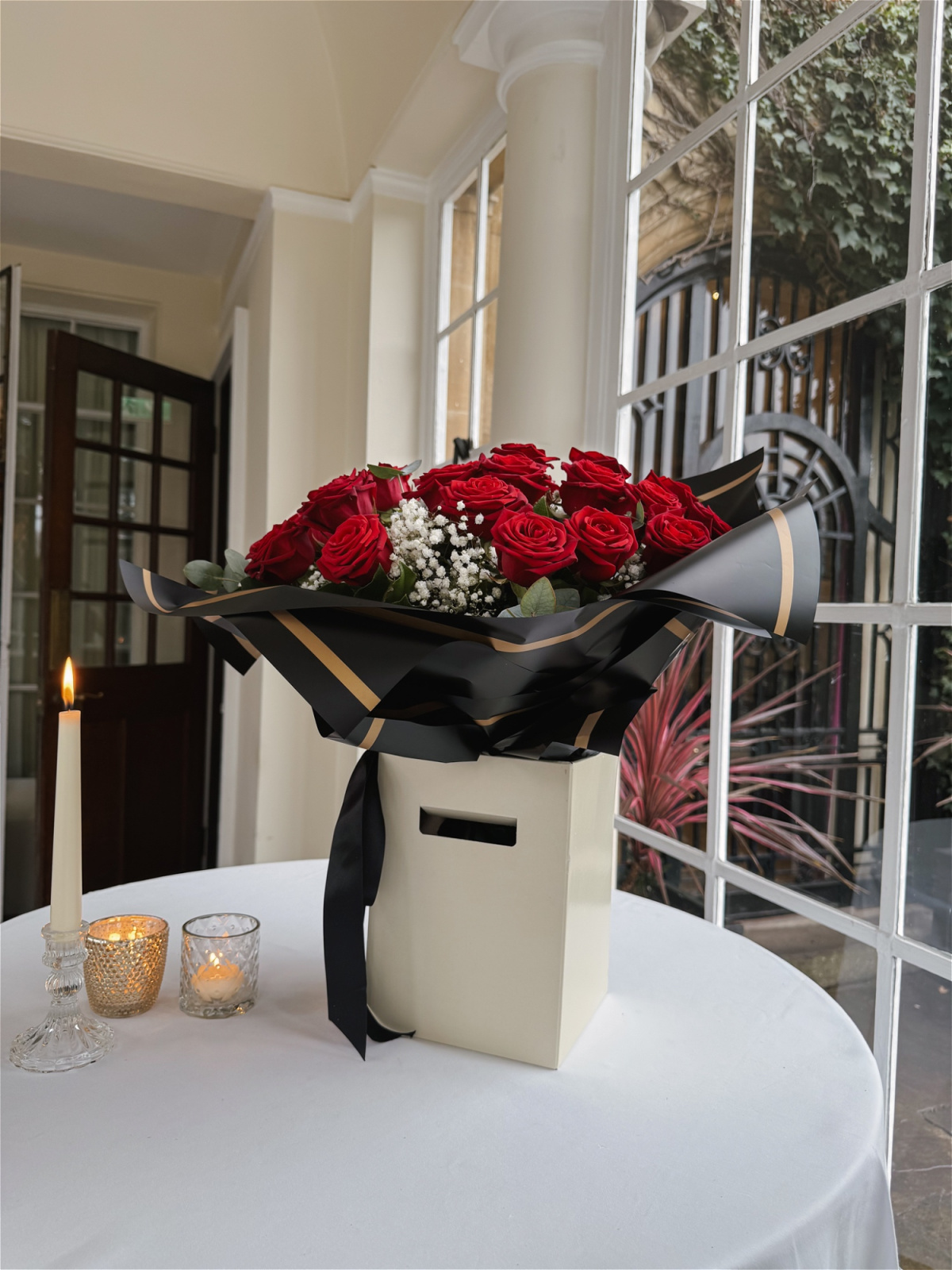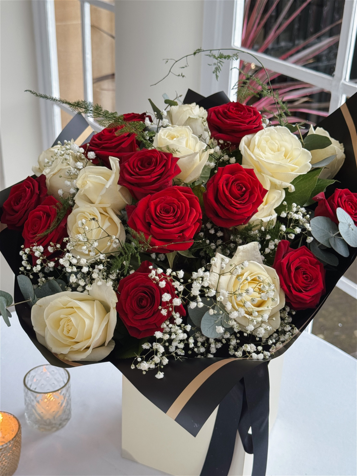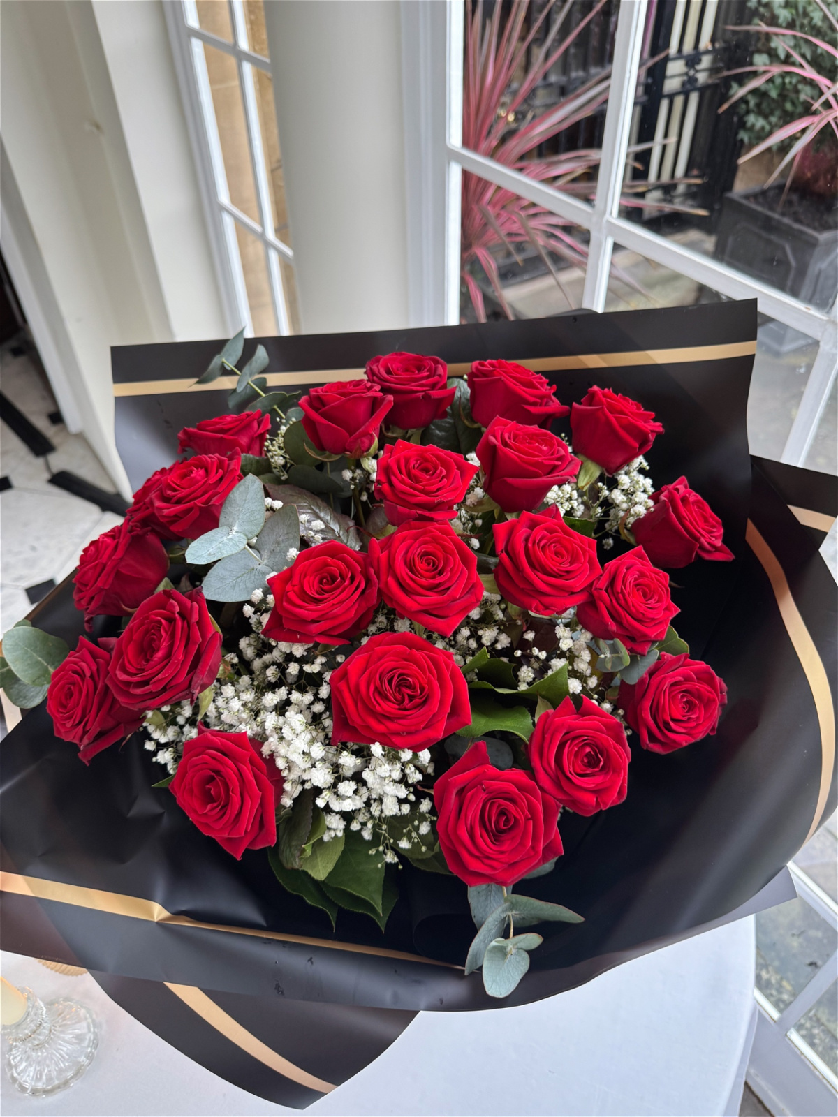 WOW!! 24 of the most stunning roses available this Valentine’s Day Accompanied by gorgeous greenery and beautiful gypsophila all beautifully arranged in a hand tied bouquet wrapped and finished off with a water bubble to keep the flowers fresher for longer.
