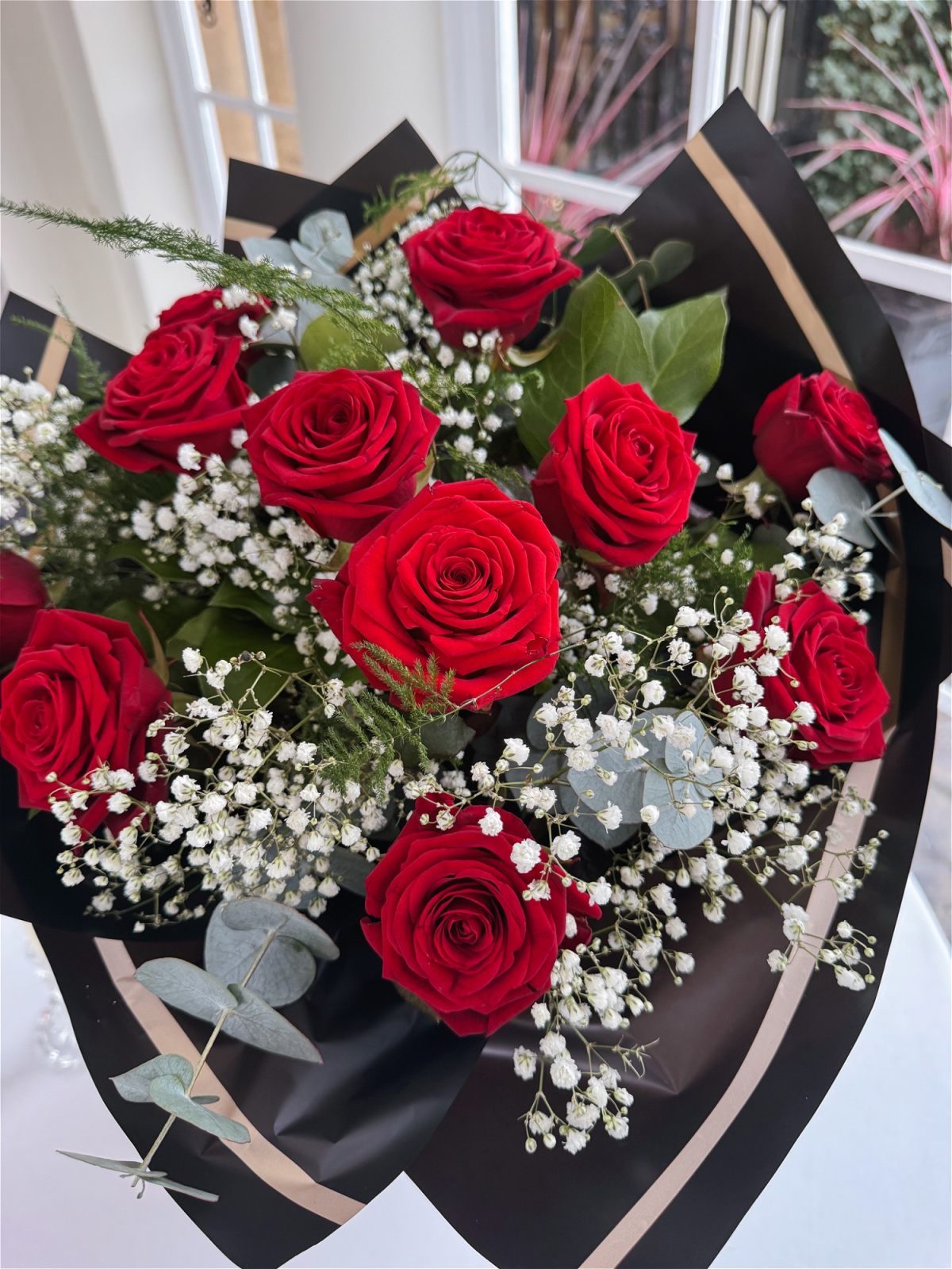 12 of the most stunning roses available this Valentine’s Day Accompanied by gorgeous greenery and beautiful gypsophila all beautifully arranged in a hand tied bouquet wrapped and finished off with a water bubble to keep the flowers fresher for longer.